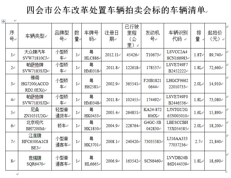 五、     拍賣標(biāo)的:車輛共8臺(tái)(標(biāo)的車輛分拆拍賣,不含車牌,具體標(biāo)的車輛詳見附件《四會(huì)市公車改革處置車輛拍賣會(huì)標(biāo)的車輛清單》)